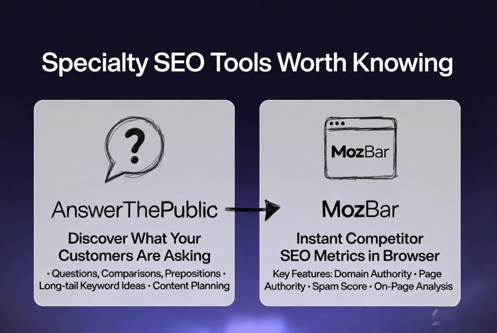 - Match tools to your actual needs — a local restaurant needs different tools than an e-commerce store. Local businesses prioritize Google Business Profile and local keyword research. E-commerce businesses prioritize technical audits and competitor product analysis